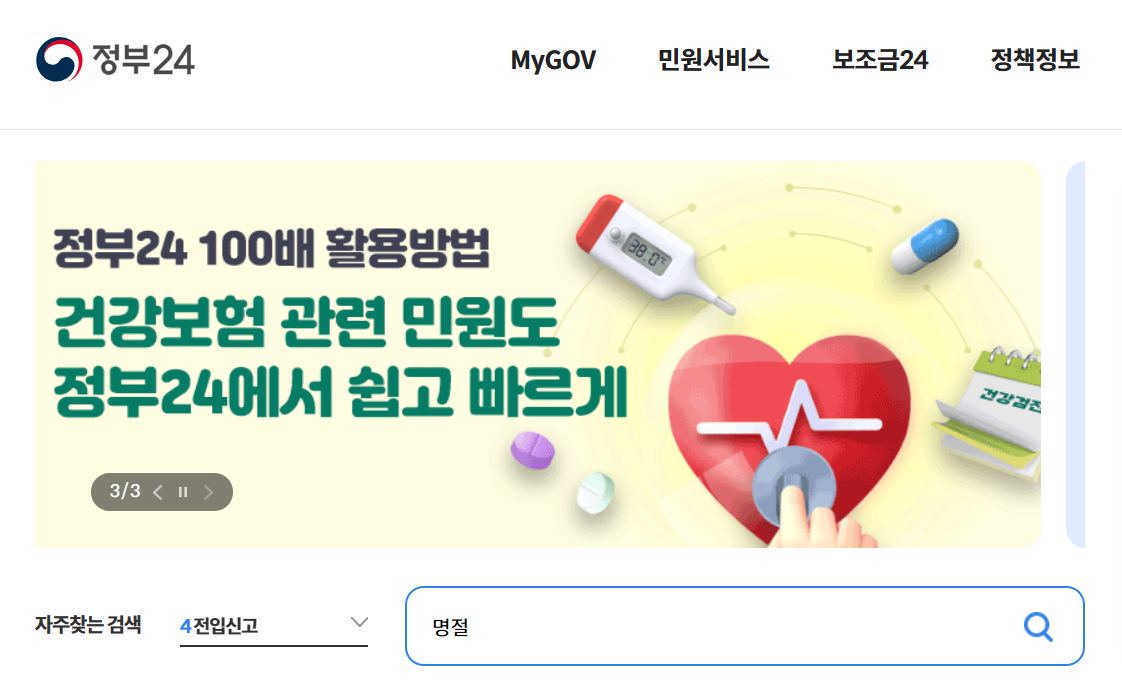 1. 정부 24 사이트에 접속 ▶ 검색창에 '명절'입력